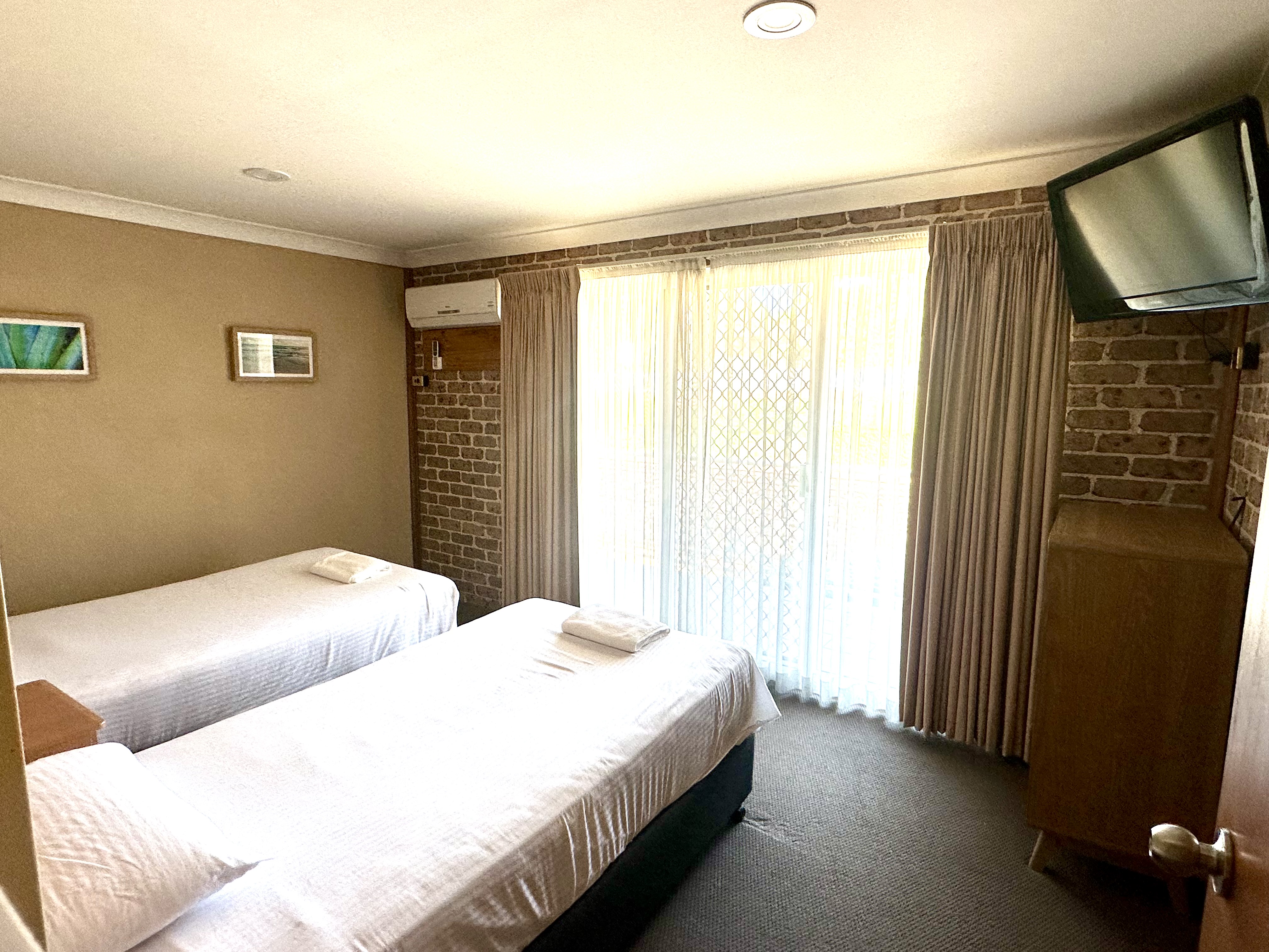 The Family Suite have 1 Queen bed, 2 Single beds and a fold out double sofa bed. The large bathroom has a bath with a separate shower and a hairdryer. Other facilities include reverse cycle air-conditioning, smart TV, Free Wi-Fi. Tea/Coffee maker, a toaster, bar size refrigerator, a private balcony with outdoor furniture for upstairs rooms and enclosed courtyard for downstairs room.