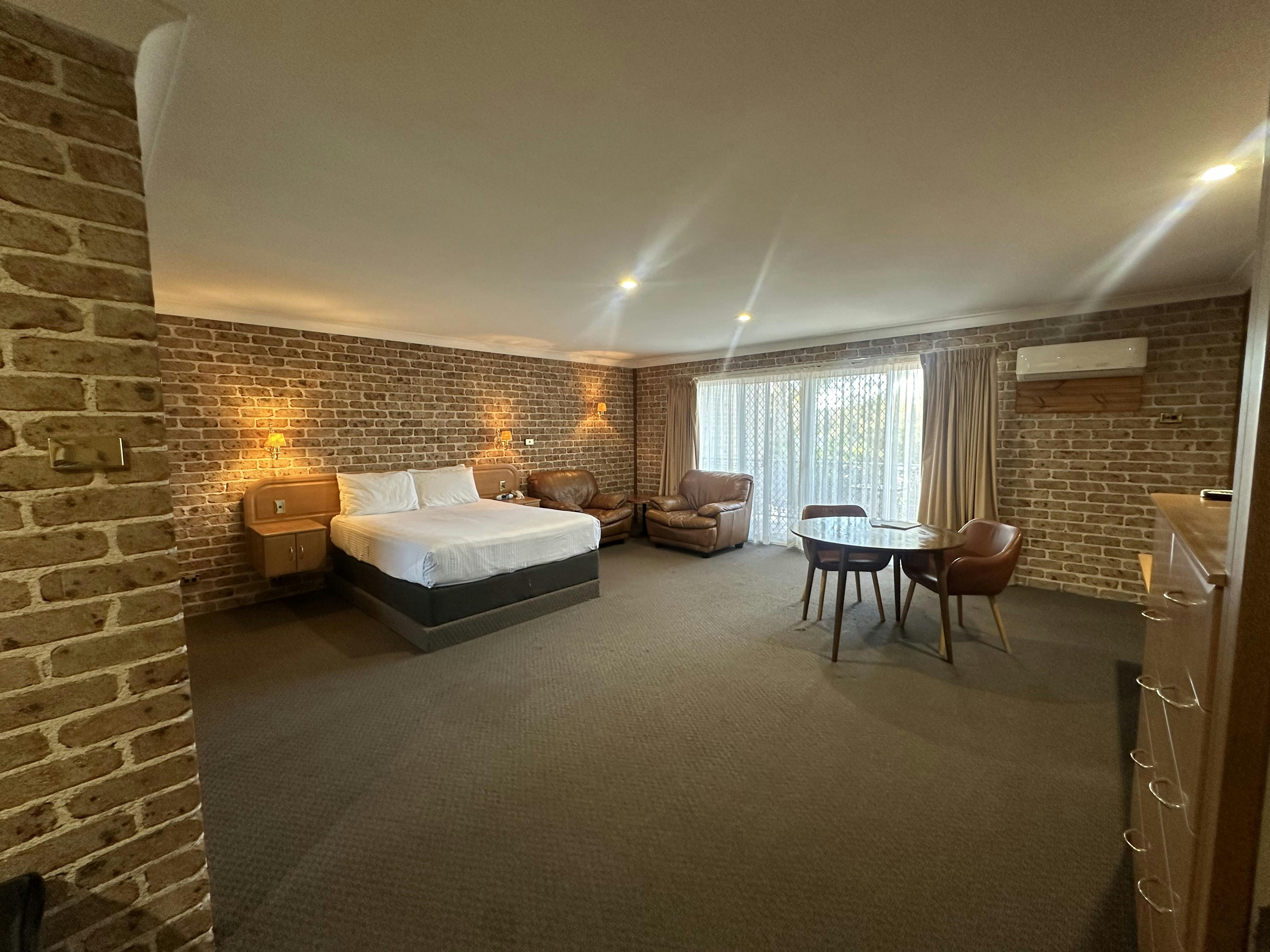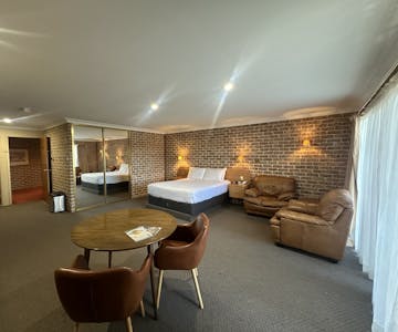 Executive spa suites have one queen bed and two comfy leather lounge chairs in a very large, spacious room with a large screen TV, free Wi-Fi, tea and coffee makers, a toaster, and an iron and ironing board. The large bathroom has double vanity basins with a large two-person relaxing spa bath. Each room has a large private balcony with outdoor furniture.